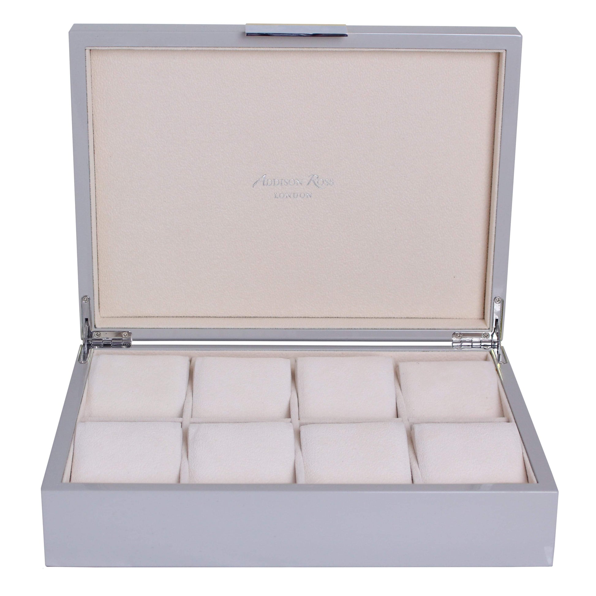 This stunning high gloss chiffon grey watch box measures approximately 8 x 10.75 inches and features a silver plated clasp with matching hinges. All of our boxes have had 20 coats of lustrous polished lacquer.