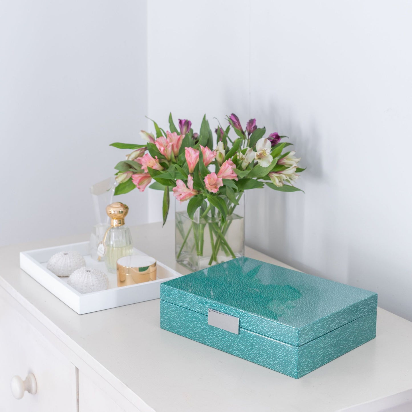 This stunning high gloss Green Shagreen Box measures approximately 8 x 10.75 inches and features a silver plated clasp with matching hinges. All of our boxes have had 20 coats of lustrous polished lacquer.