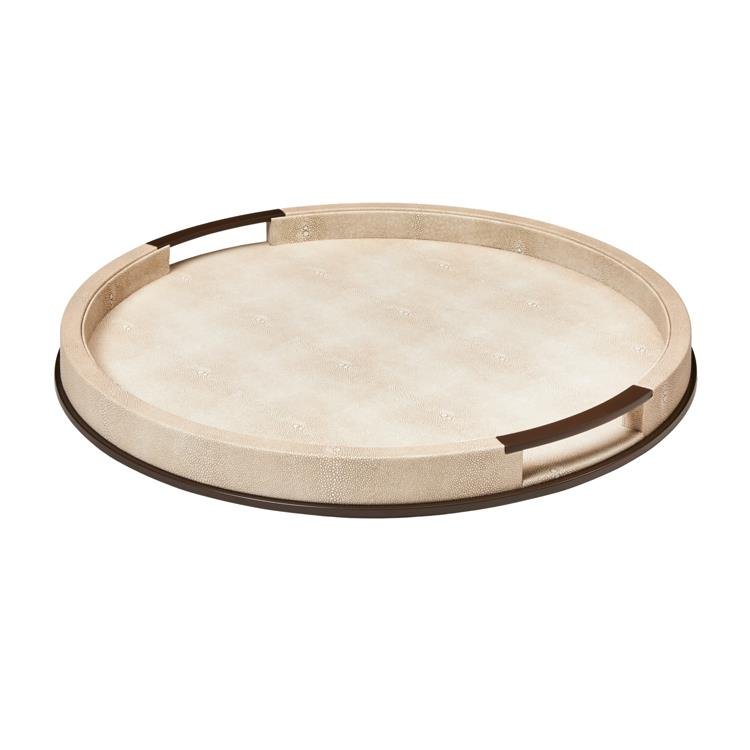 Expanding our collaboration with Sophie Paterson, unveiling a cream-colored large round ecru faux shagreen tray. This round display tray features an elegant bronze-coloured metal trim and handles, beautifully lined with cream velvet. Remember to clean gently with a dry cloth, avoiding cleaning sprays. Comes exquisitely gift boxed.