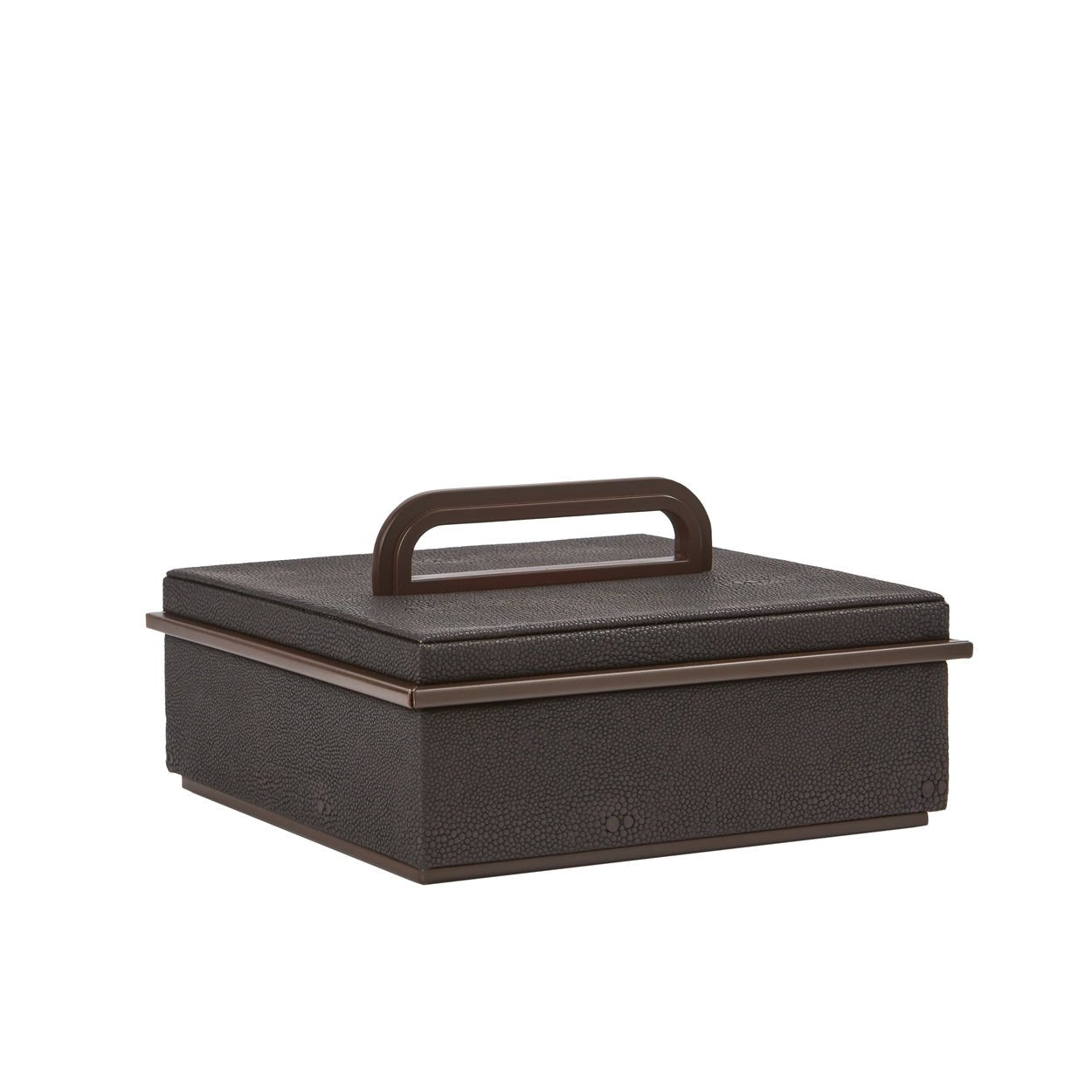 Introducing our collaboration with Sophie Paterson, unveiling an exquisite small black anthracite shagreen box. It showcases an elegant bronze-coloured metal trim, a lift-off separate lid, and a cream velvet lining. Remember to clean gently with a dry cloth, avoiding cleaning sprays. Comes beautifully gift boxed.