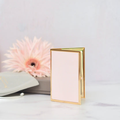 Show off your favorite photos on any occasion with this elegant and pretty purse and travel frame. Holds two 2x3 in portrait photos in a pastel pink enamel case finished in gold plate.
