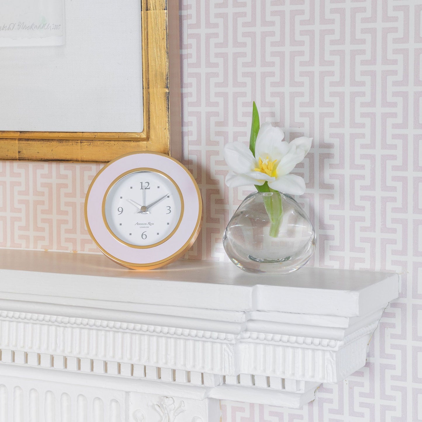 Pastel blue is finished in gold plate with a luxury dove grey velvet back. This gorgeous desk or bedside round clock has an alarm and the movement is encased within a removable silver cover. The clock comes with 2 screw in legs.